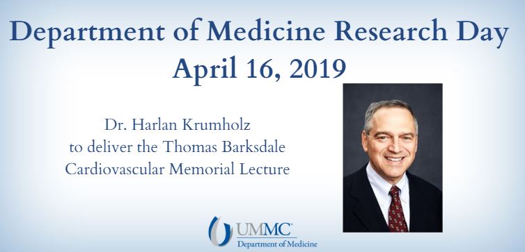 The Department of Medicine Research Day is April 16, 2019. The event will include oral presentations, a poster session and competition, keynote lecture and awards ceremony. This year, the department is pleased to announce Dr. Harlan Krumholz will deliver the keynote Thomas Barksdale Cardiovascular Memorial Lecture entitled, “Learning At The Speed Of Digital: The Next Step Toward A Learning Health System.” Dr. Krumholz received a BS from Yale, an MD from Harvard Medical School, and a Masters in Health Policy and Management from the Harvard University School of Public Health. He is the Harold H. Hines, Jr. Professor of Medicine and Director of the Yale Center for Outcomes Research and Evaluation (CORE), one of the nation’s first and most productive research units dedicated to producing innovations to improve patient outcomes and promote better population health. He is also a Director of the Robert Wood Johnson Foundation Clinical Scholars Program, which prepares talented physicians to become future health care leaders. Dr. Krumholz has published more than 800 articles and is the author of two books, one on smoking cessation and another on reducing the risk of heart disease. He has a regular blog on Forbes.com and has contributed to the New York Times Wellness blog, the New York Times op-ed page, and National Public Radio Shots blog.