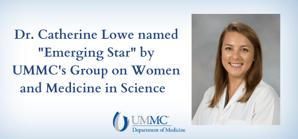 Dr. Catherine Lowe, PGY-5 in Cardiology, was selected for the “Emerging Star” Award by UMMC’s Group on Women in Medicine and Science (GWIMS). The GWIMS organization, an initiative of the AAMC, seeks to advance the full and successful participation and inclusion of women within academic medicine by addressing gender equity, recruitment and retention, awards and recognition, and career advancement. The local GWIMS chapter honors distinguished individuals who have substantially impacted as well as have made significant contributions to the UMMC community and the larger community as a whole.