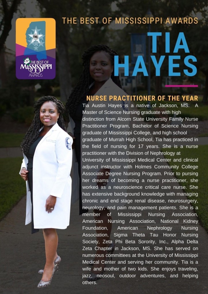 Tia Hayes in Nephrology named Nurse practitioner of the year in the best of MIssissippi Awards August 18, 2020 ummcmedicine Faculty and Staff, Nephrology Leave a comment Share this: Click to share on X (Opens in new window) X Click to share on Facebook (Opens in new window) Facebook Like Loading... Related