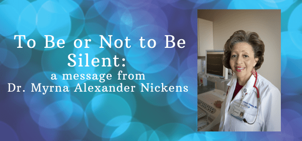 1. Thank you Dr. Myrna Alexander Nickens for truly addressing the “elephant in the room.” As a general internist, I concur with the acknowledgement and recommendations to “Speak up” and not to be silent regarding our interaction with patients of different ethnicities. Physicians are looked upon as leaders in the community whether we desire to or not. If we don’t address the problem, who will?