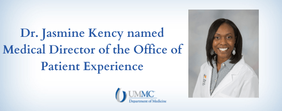 Dr. Jasmine Kency, Assistant Professor in the Division of General Internal Medicine, has been named Medical Director of the Office of Patient Experience (OPE). She succeeds Dr. Lisa Didion, and in her new leadership role, Dr. Kency will work directly with hospital executive leaders, OPE staff, UMMC medical staff and other stakeholders to sustain and grow work that supports patient and family centered care at UMMC. Dr. Kency completed her undergraduate degree at Spellman College, medical degree from the University of South Alabama, and residency in medicine-pediatrics at UMMC. After a year as chief resident in Pediatrics, Dr. Kency joined faculty in the Division of General Internal Medicine. She also serves as her division’s Education Coordinator for the internal medicine residency program, on the House Officer Selection Committees for internal medicine and medicine-pediatrics, and as Faculty Lead for the Department of Medicine Grand Rounds Committee. Congratulations Dr. Kency!