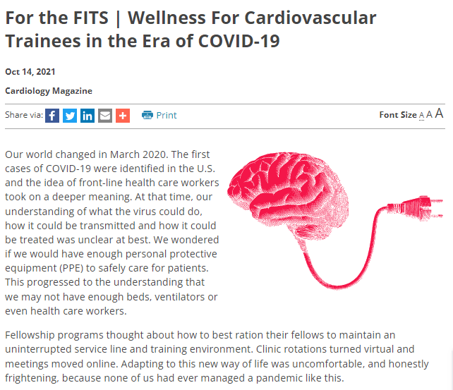 Dr. Andrew Brown has authored a timely article in the American College of Cardiology magazine discussing burnout, wellness, and the COVID-19 pandemic. The article, entitled “Wellness For Cardiovascular Trainees in the Era of COVID-19” discusses Mississippi’s experience with the pandemic as well as national cardiology fellows-in-training (FITS) wellness data and potential actions, both systemic and individual to combat burnout. Dr. Brown completed medical school, internal medicine residency, and chief residency at UMMC and is currently a PGY-V in Cardiovascular Diseases.