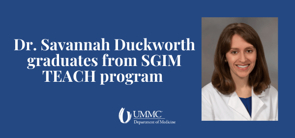 Dr. Savannah Duckworth, Assistant Professor in General Medicine, has graduated from the Society of General Internal Medicine’s prestigious TEACH (Teaching Educators Across the Continuum of Healthcare) program. The two-year program focuses on enhancement of teaching skills for clinician educators and is provided by a national community of educators. Dr. Duckworth was awarded her certificate at the SGIM Annual Meeting in Orlando last month. Congratulations Dr. Duckworth!