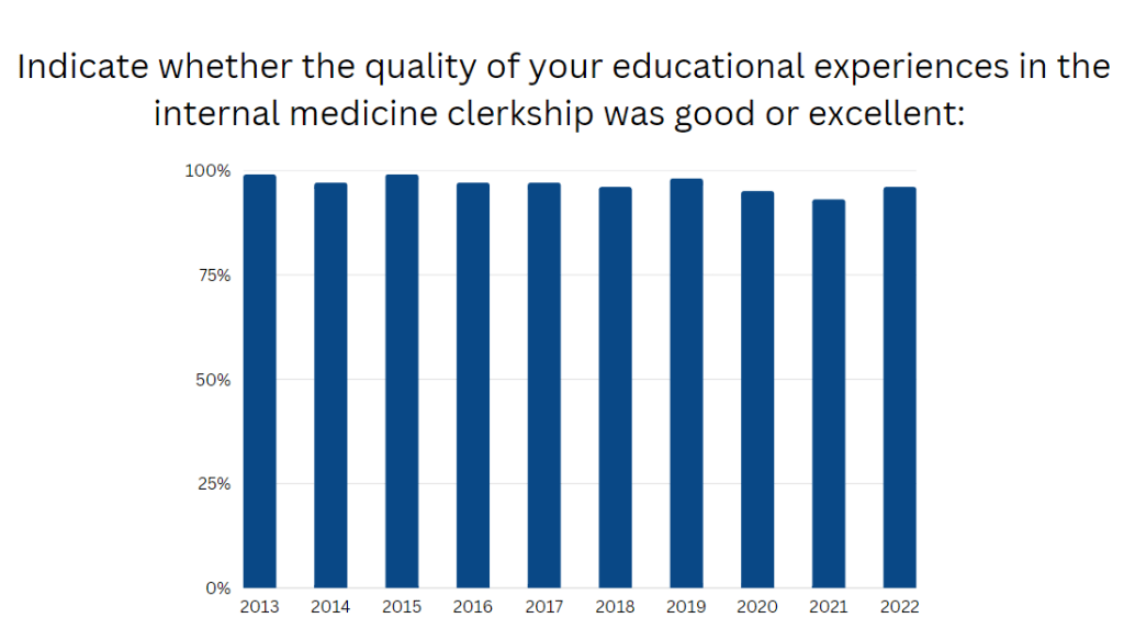 Each year, students graduating from allopathic medical schools in the United States are asked to complete a Graduation Questionnaire by the Association of American Medical Colleges (AAMC). The results of the questionnaire are made available to the School of Medicine and include a rating by each student of the quality of the educational experience in each clinical clerkship. The accompanying table indicates the percent of students each year who rated the clerkship educational experience as “Good” or “Excellent.” As you can see, the internal medicine clerkship has performed exceptionally well on the questionnaire for the last 10 years, and we are happy to say that it is the highest ranked clerkship on campus. This is in large part due to the outstanding leadership of Dr. Michelle Horn, who has led the internal medicine clerkship during that entire ten-year period and who was joined in that leadership by Dr. Zeb Henson in 2021-2022 as Dr. Horn transitioned to the role of Division Director of General Internal Medicine. Jennifer Chappell, Medical Education Administrative Director, has served as the clerkship program administrator for the past 15 years and has also been instrumental in its success. Destini Dill has recently joined the Department as Student Project Manager and assists in coordinating lectures, workshops, tests, and performance evaluations.