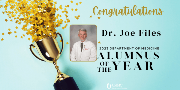 Dr. Joe Files was chosen as the 2023 Department of Medicine Alumnus of the Year. He was awarded at Scholarship Day on April 18th in the Student Union. Congratulations Dr. Files!