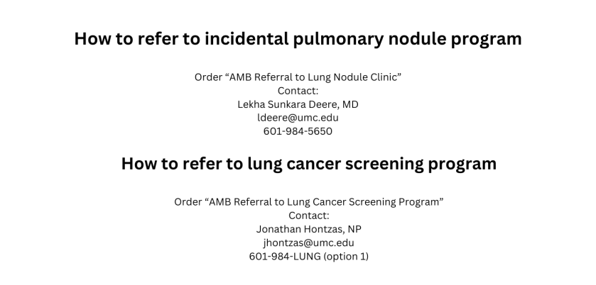 The UMMC Incidental Pulmonary Nodule Program is a specialized medical service designed to evaluate, monitor, and manage patients with incidentally found lung nodules. These incidentally found nodules can represent a wide array of underlying pathology, the most worrisome of which is malignancy and requires specialized and individualized care. It is estimated that up to thirty percent of CT scans performed detect an incidental nodule.