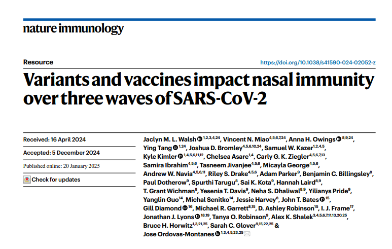 Several faculty and trainees co-authored an important study published last month in Nature Immunology titled “Variants and vaccines impact nasal immunity over three waves of SARS-CoV-2.” The article describes how the research group used single-cell RNA sequencing on nasopharyngeal swabs from both vaccinated and unvaccinated adults with acute COVID infection. This important study helps to drive forward data regarding immune and inflammatory responses to SARS-CoV-2 across varying variants and vaccination status. Co-authors included Anna Owings, Adam Parker, Ben Billingsley, Paul Dotherow, Spurthi Tarugu, Hannah Laird, Grant Wichman, Sai Kota, Yesenia Davis, Neha Dhaliwal, Yilianys Pride, Yanglin Guo, Michal Senitko, Jessie Harvey, Tanya Robinson, John Bates, Michael Garrett, I.J. Frame, and Sarah Glover.