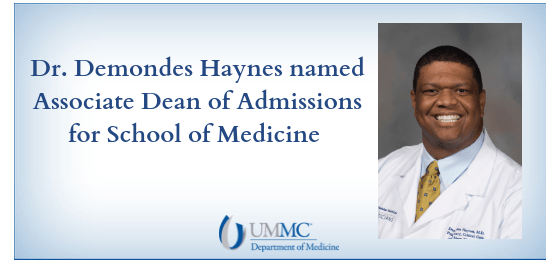 Dr. Demondes Haynes has been named Associate Dean of medical school admissions. Dr. Haynes is a Professor of Medicine in the Division of Pulmonary and