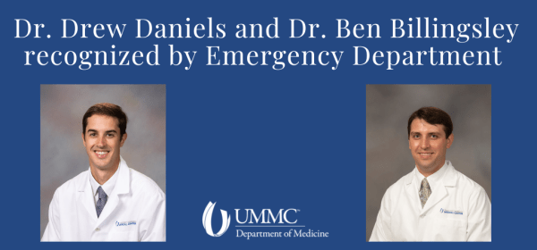Dr. Drew Daniels, PGY-IV cardiology fellow, was named ER Consultant of the Year and Dr. Ben Billingsley, categorical internal medicine PGY-1, was named ER Rotator of the Year. Congratulations to Drs. Daniels and Billingsley!